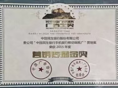 中国广告长城奖-广告主奖-营销传播金奖-中国民生银行手机银行移动端推广项目-中国广告协会+中国广告长城奖广告主奖组委会颁发