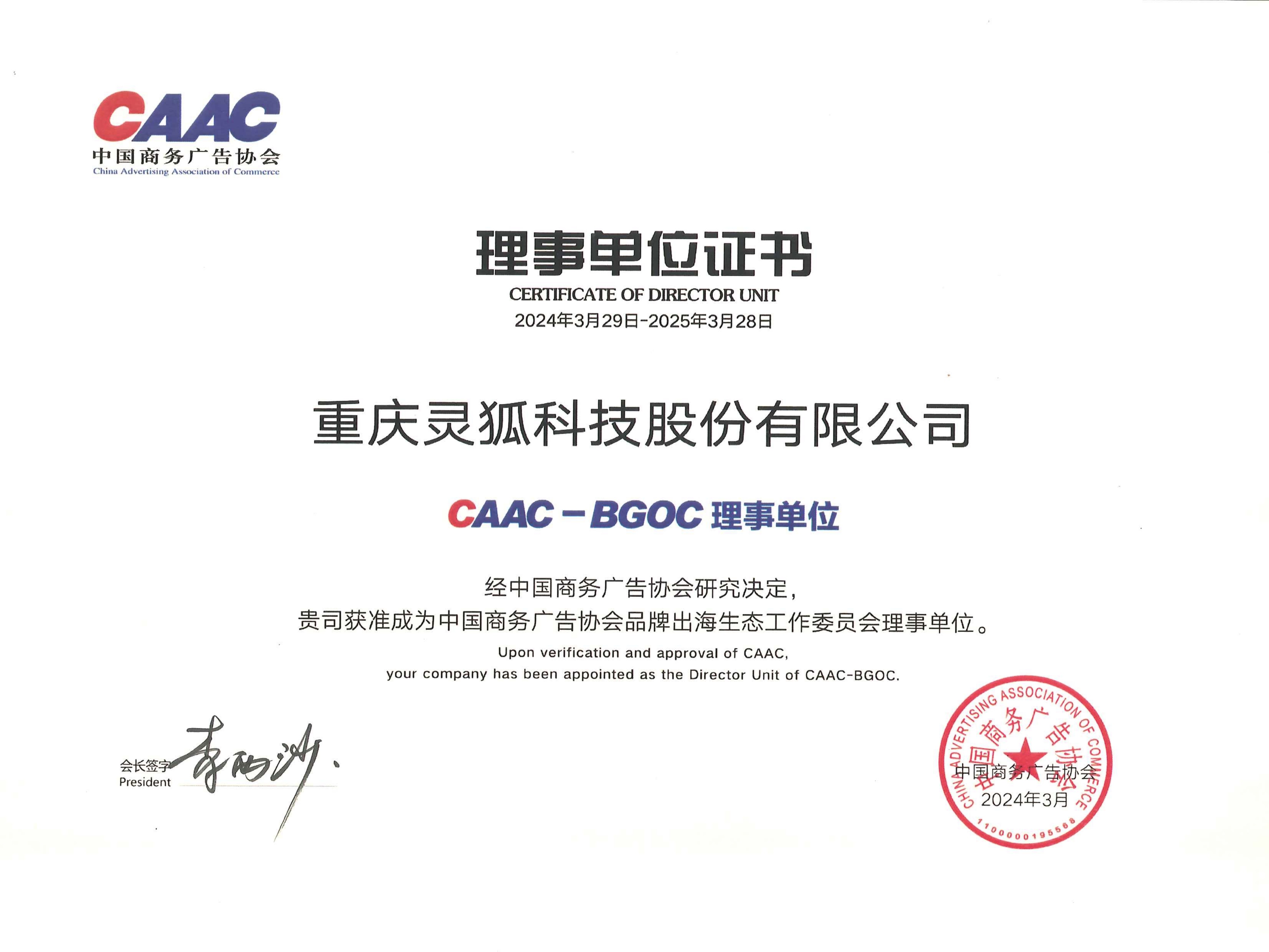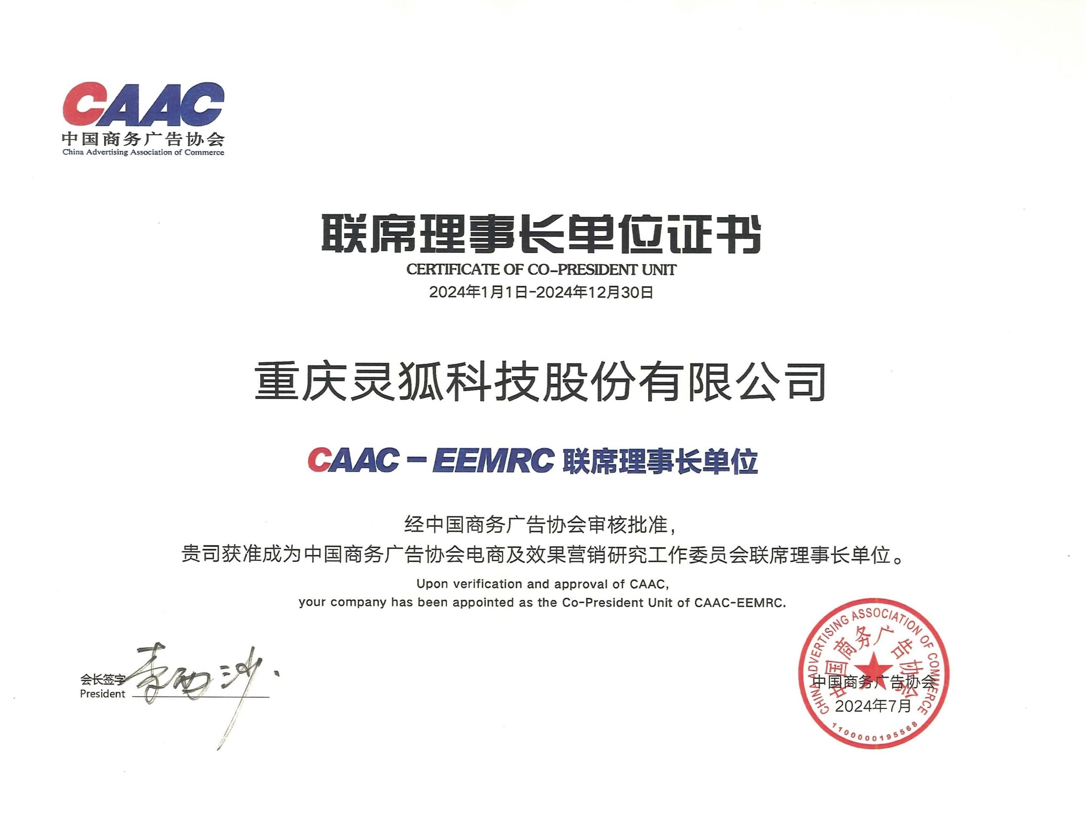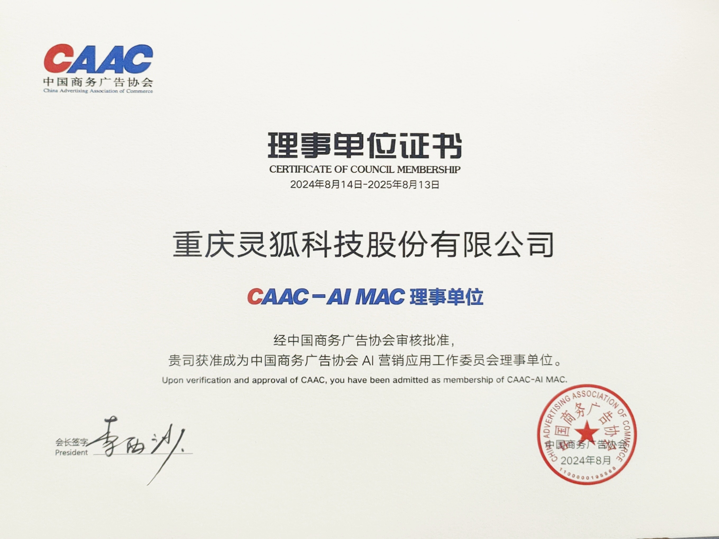 灵狐科技CAAC联席事长证书