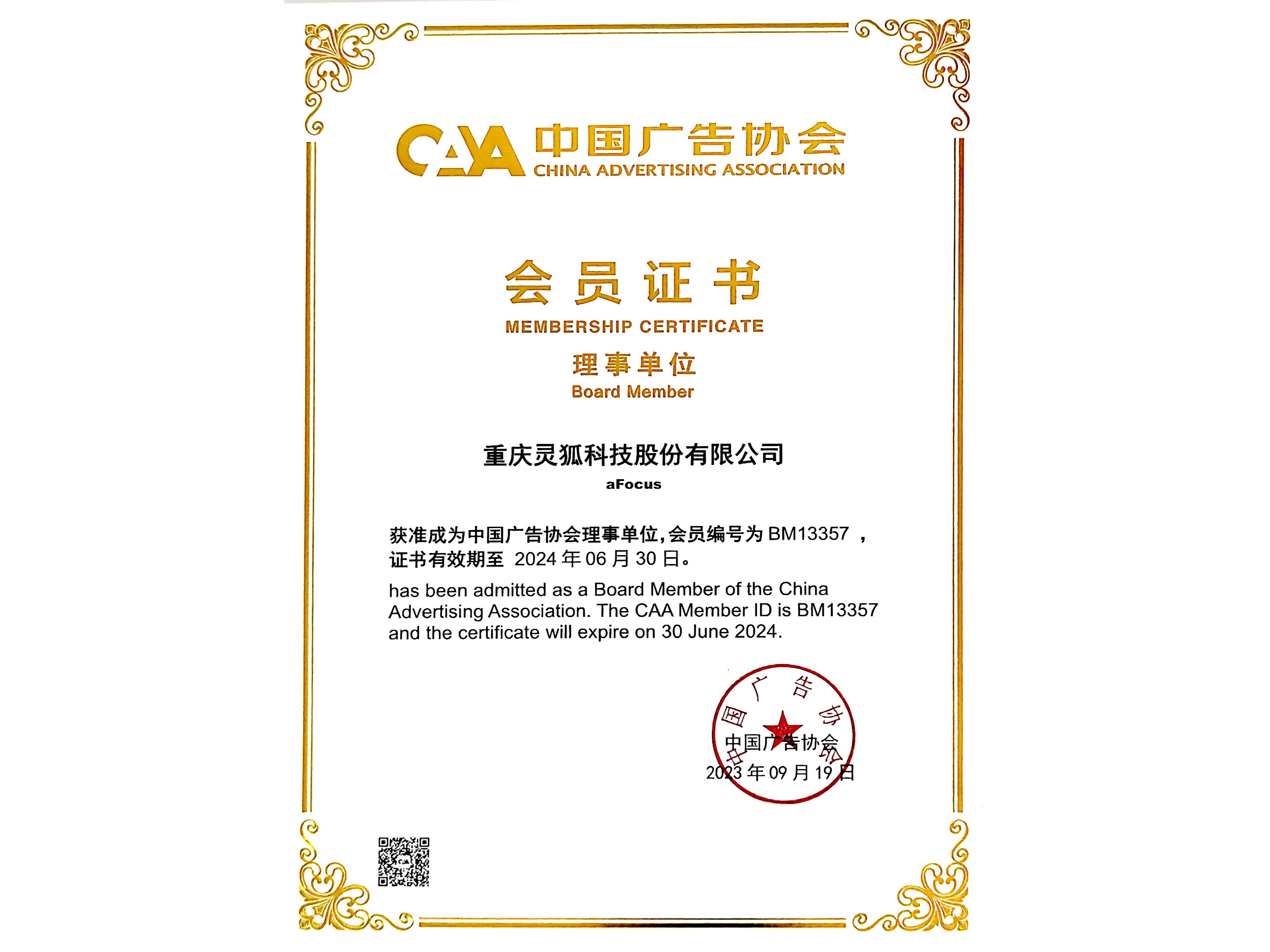 中国广告协会理事单位证书
