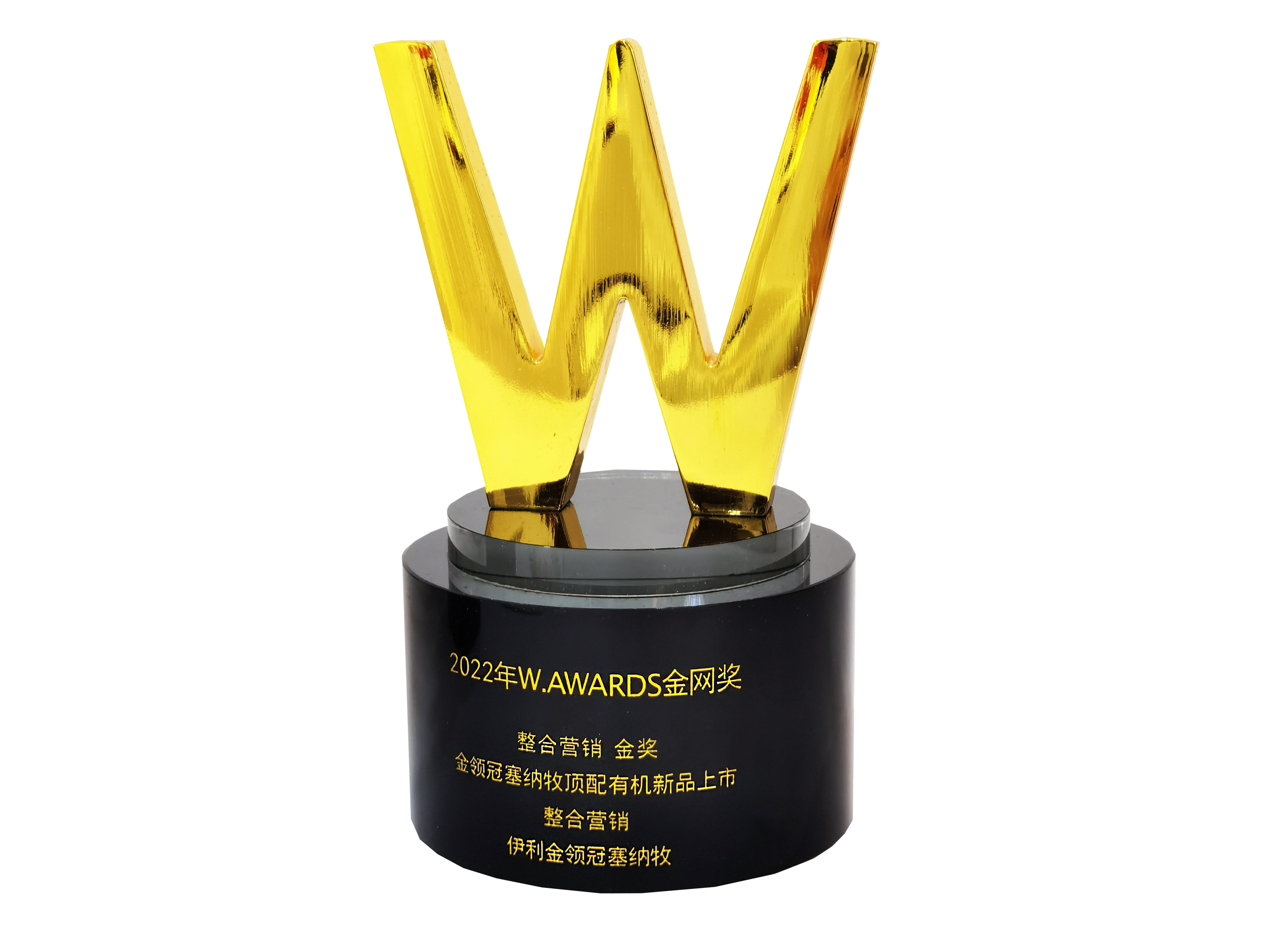 2022年W.AWARDS金网奖整合营销金领冠塞纳牧顶配有机新品上市整合营销金奖奖杯