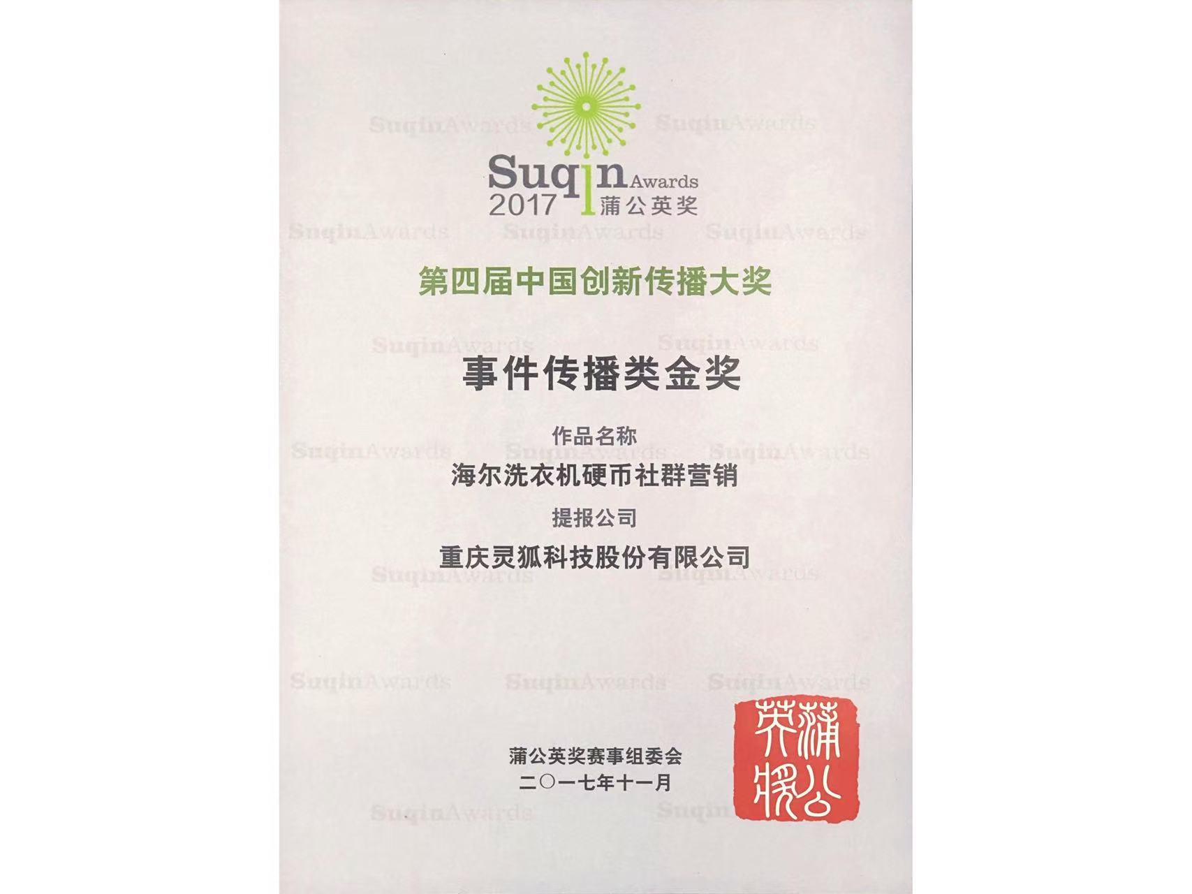 第4届中国创新传播大奖-蒲公英奖-事件传播类-金奖-证书-海尔洗衣机硬币社群营销项目-蒲公英奖赛事组委会颁发