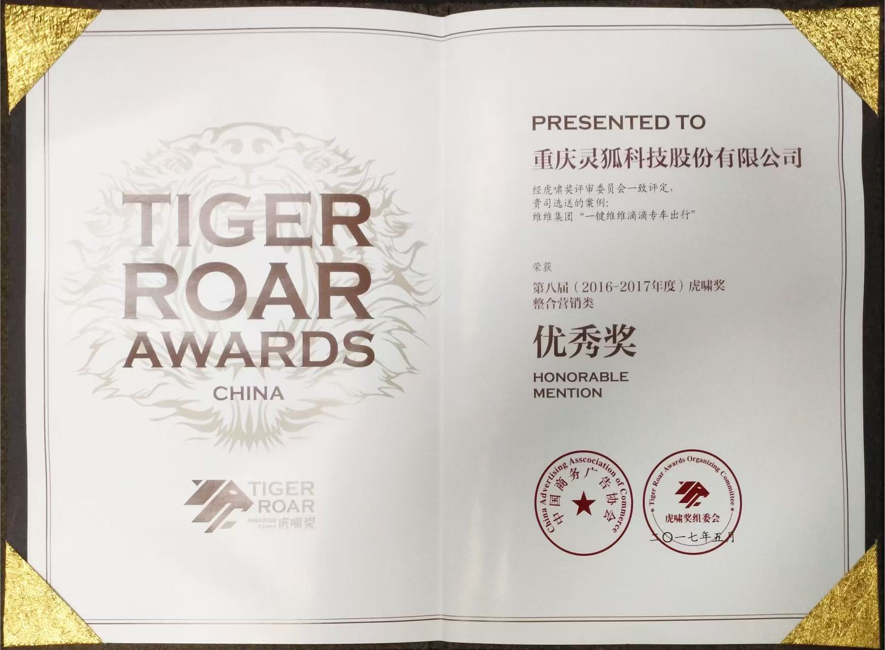 虎啸奖-整合营销类-优秀奖-奖状-维维集团一键维维滴滴专车出行项目-中国广告协会+虎啸奖组委会颁发